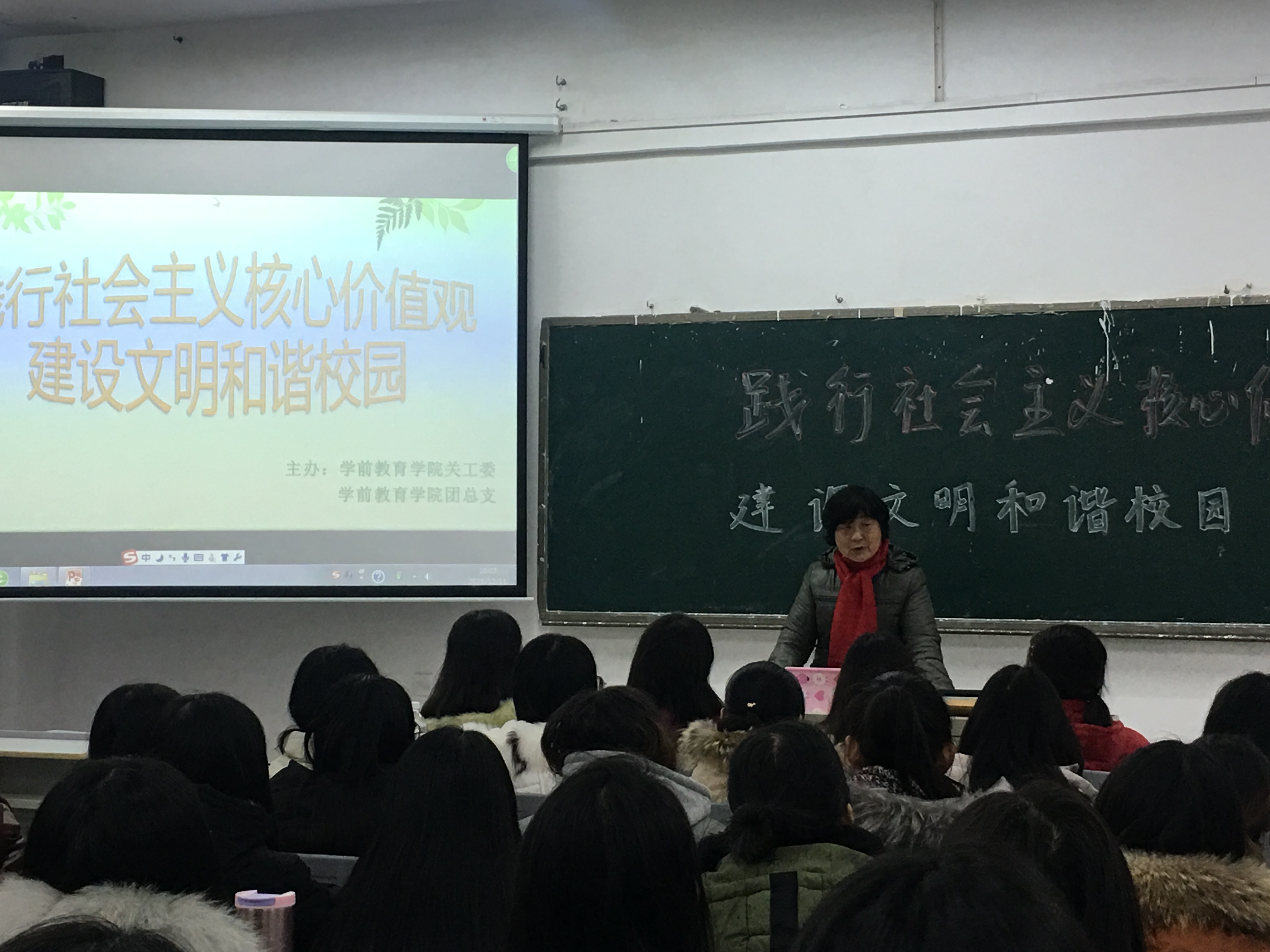 为加强文明和谐校园建设,12月11日下午,学前教育学院关工委组织了一次精彩的讲座,主讲人是退休老师刘菊芳。刘老师以社会主义核心价值观为主题,结合学院青年学生的思想实际,围绕社会主义核心价值观中的“和谐”,具体阐述了关于“建设文明和谐校园”方面的诸多问题,讲得深入浅出,举例广泛生动,学生听得津津有味。刘老师还以自己退休前后的学习经历现身说法,说明“世上无难事,只怕有心人”,积极鼓励学生努力学习,刻苦训练技艺,做到勤学、修德、明辨、笃实,切实践行社会主义核心价值观,把自己造就成合格的学前教育专业的好学生,为打造文明和谐校园出力,毕业后,在各自的岗位上报效祖国,为实现中华民族伟大复兴的中国梦贡献力量。