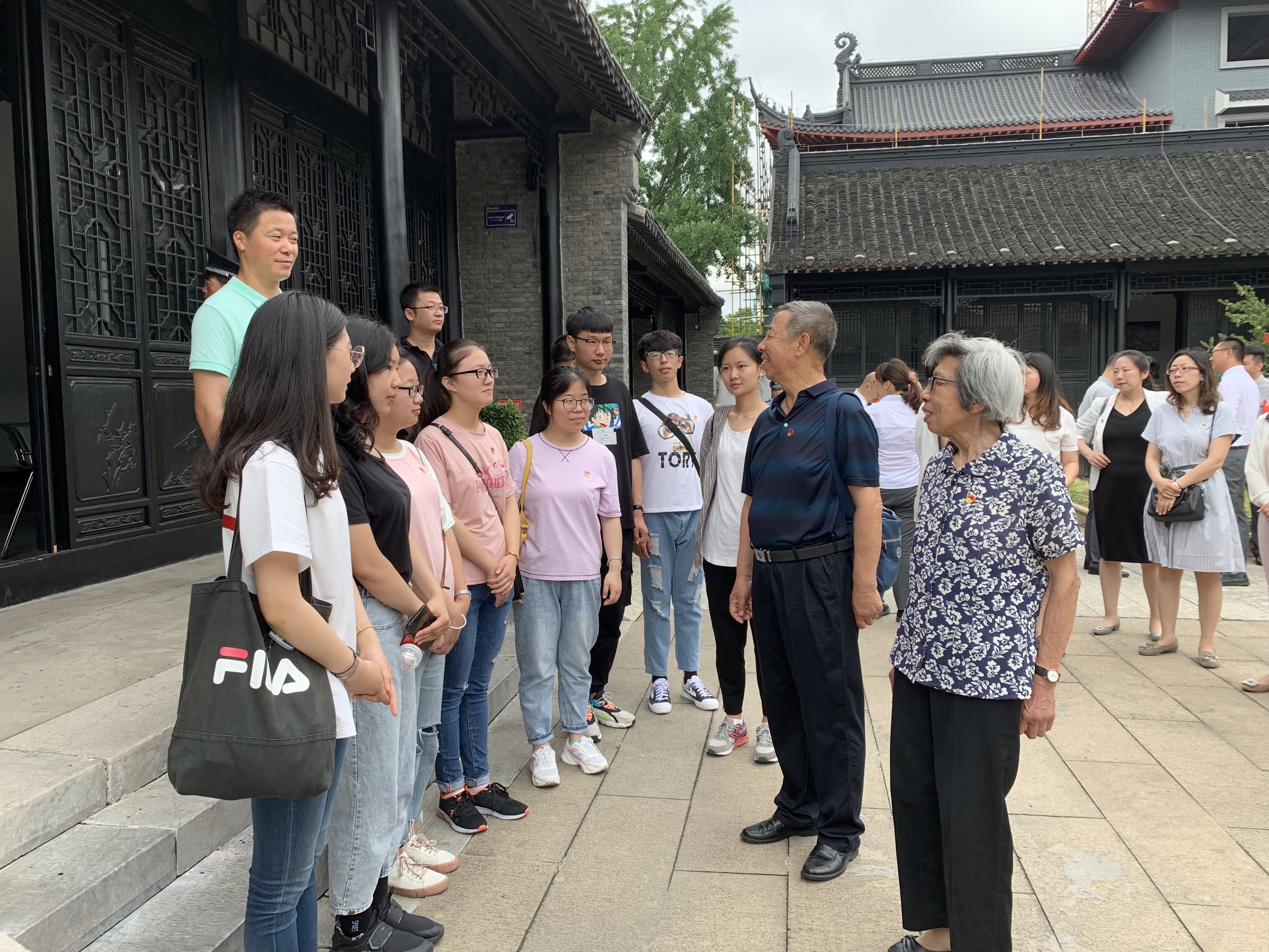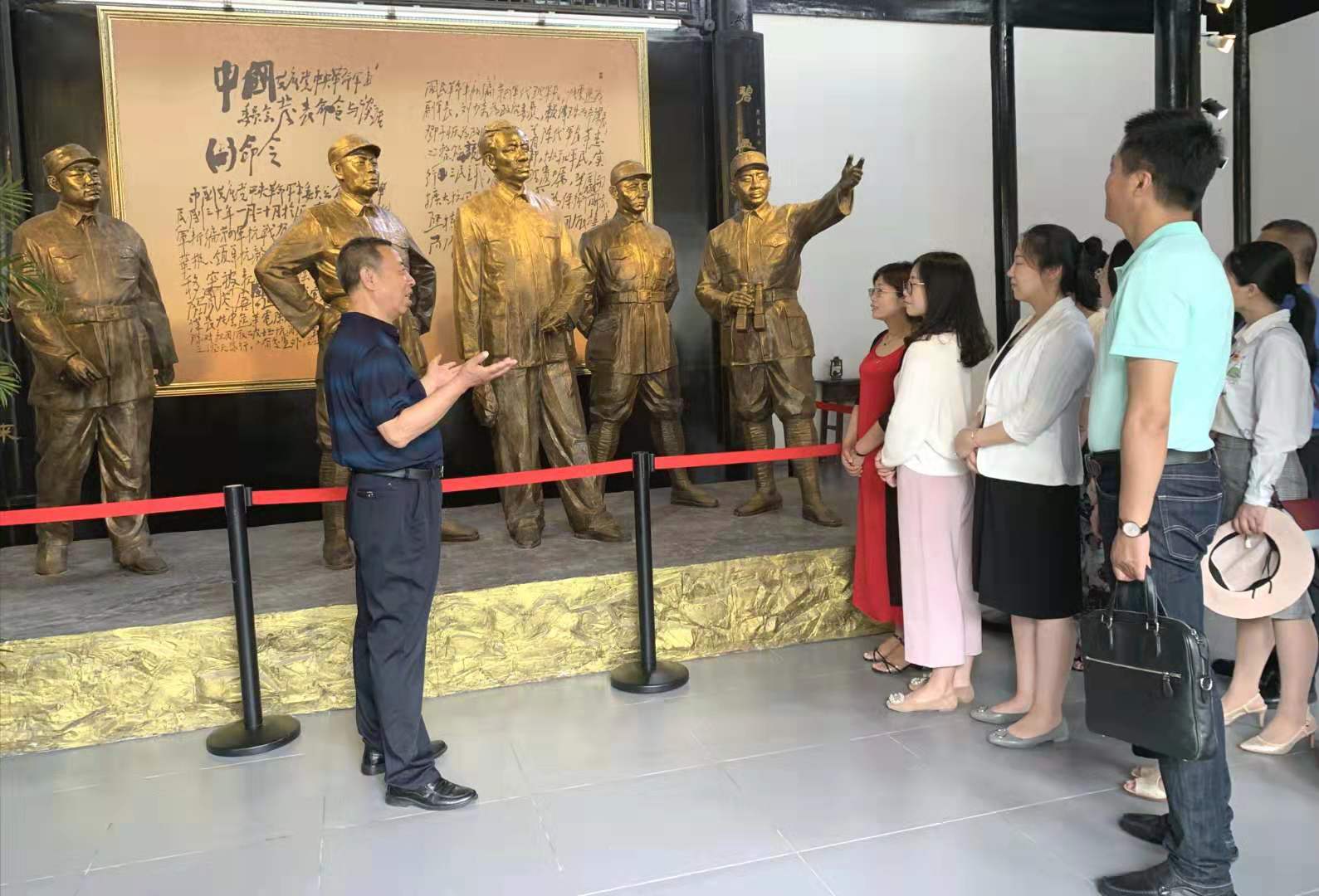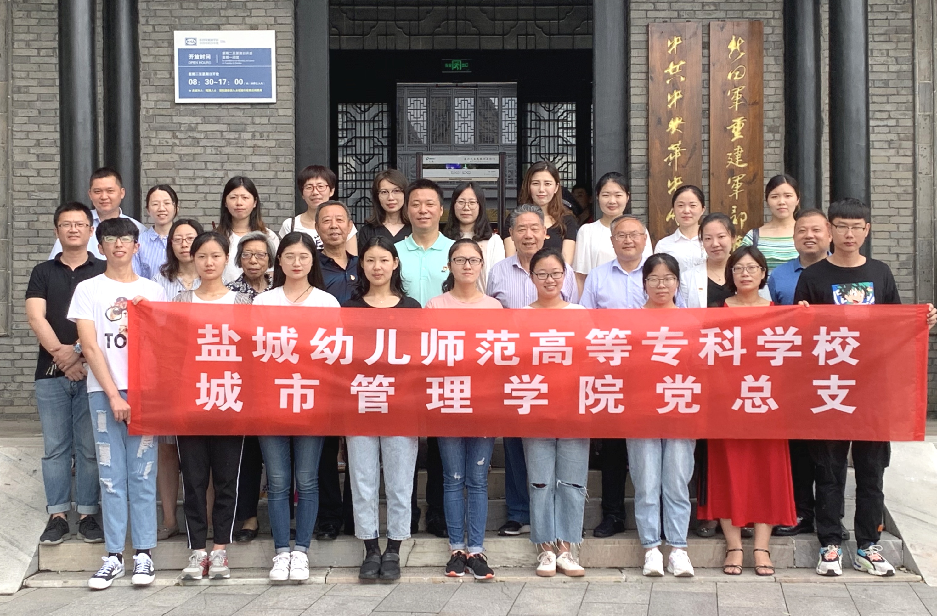 6月29日,盐城幼儿师范高等专科学校城市管理学院党总支为庆祝建党98周年,进一步发挥老党员在青年党员中的示范引领作用,培养青年党员的爱党爱国情怀,坚定青年党员的政治信仰,组织开展了“参观红色教育基地,重温入党誓词”主题党日活动,邀请了老党员孟金保、魏文元、王福安等到新四军军部旧址---泰山庙参加活动,为青年党员现场讲授红色革命传统。