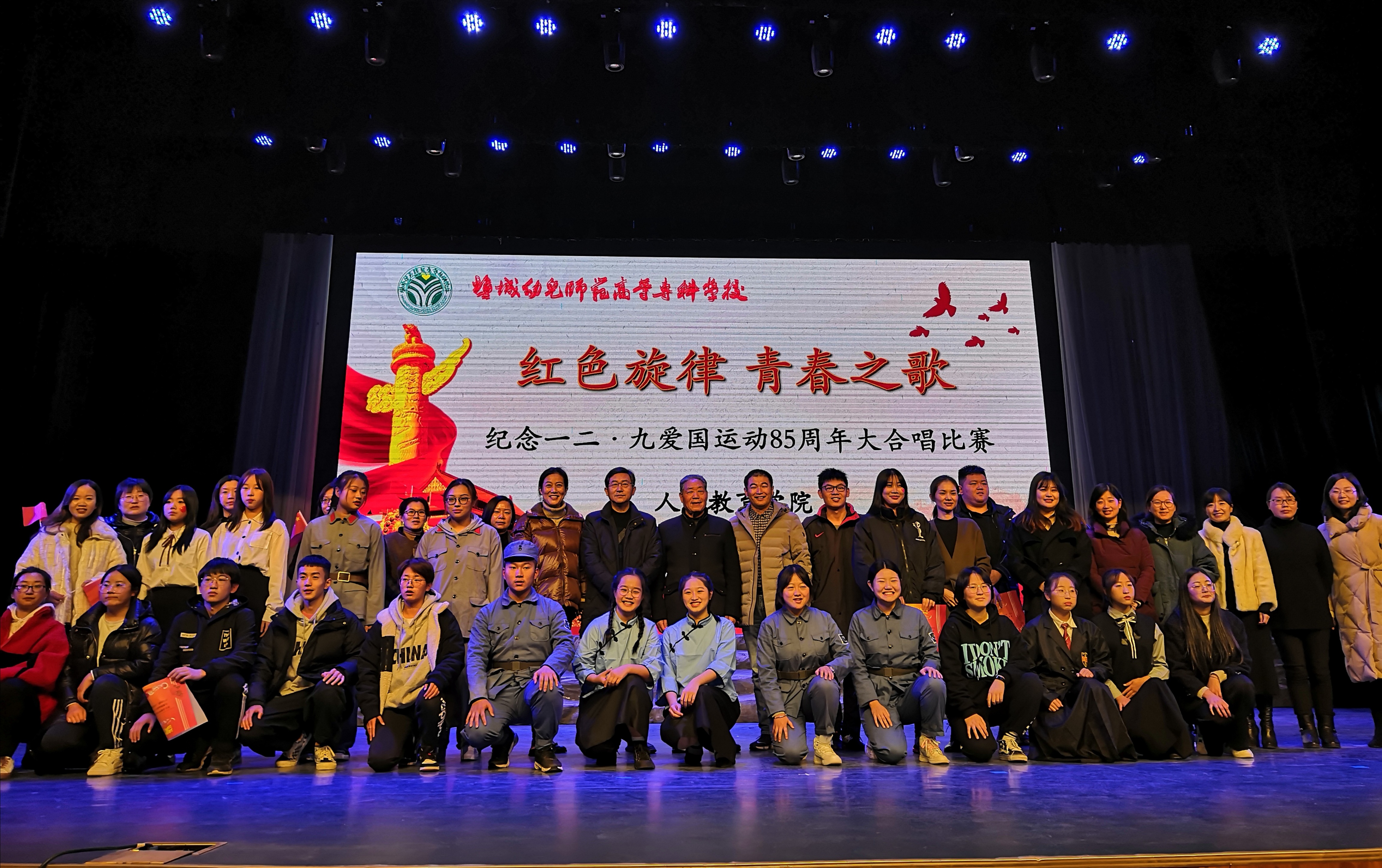为纪念“一二·九”学生爱国运动85周年,引导学生进一步了解历史、铭记历史,学习领悟十九大五中全会精神,丰富校园文化生活,增强学生的爱国热情、振兴中华的责任感和班级的团队合作精神,人文教育学院关工委于12月2日下午在鲁艺剧场举办了“红色旋律 青春之歌”——纪念“一二·九”爱国运动85周年大合唱比赛。比赛特邀校关工委孟金保老校长观摩指导,人文教育学院仇玉文院长、席培华书记、周麟副院长、关工委张芸和叶捷老师一同出席。