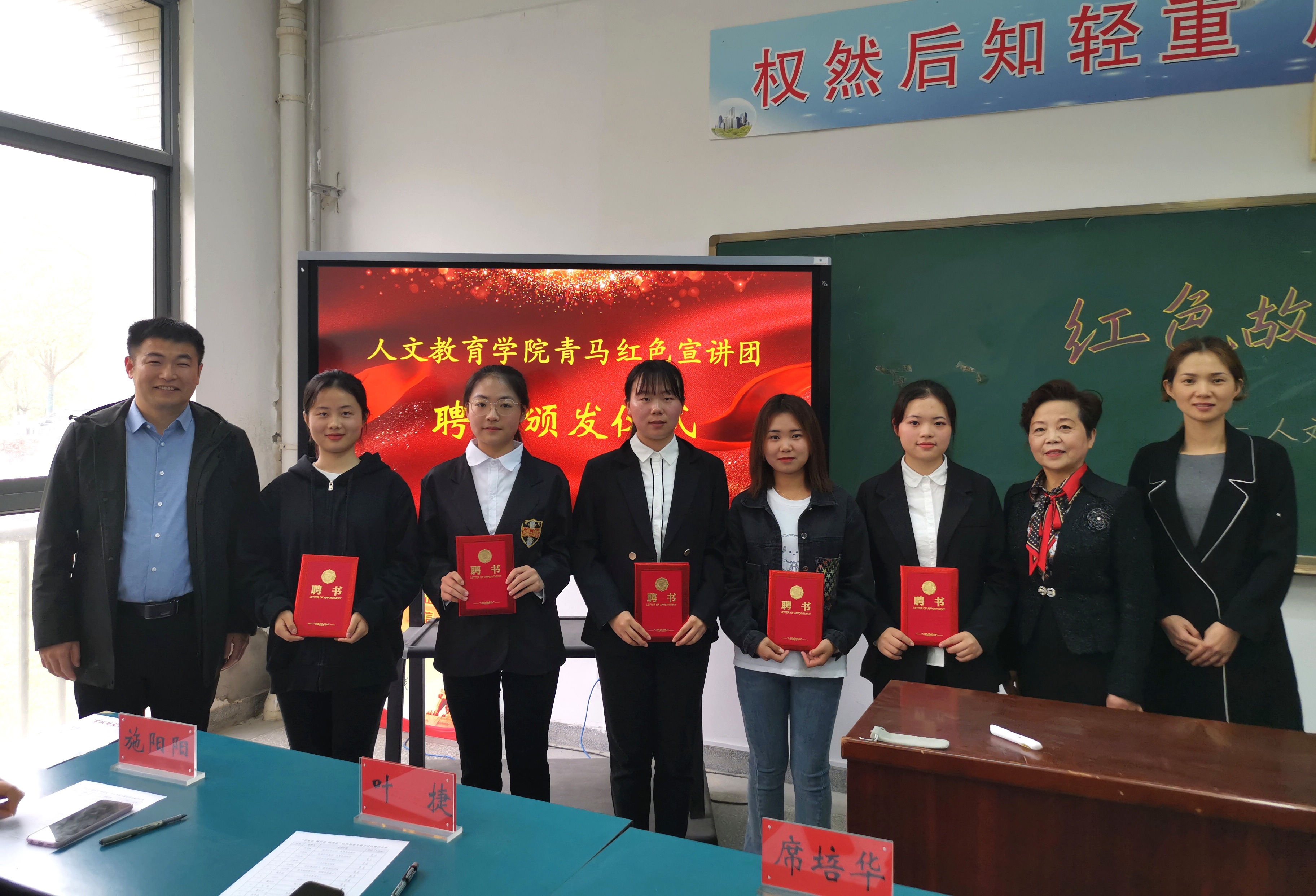通过前期初赛、复赛的选拔,13名政治素质好、宣讲能力强的参赛选手正式成为人文教育学院“青马红色宣讲团”的首批成员,学院特聘李玲教授为“青马红色宣讲团”指导教师,席培华书记和周麟副院长为李玲教授颁发聘书。随后,李玲教授为13名宣讲团同学颁发聘书。