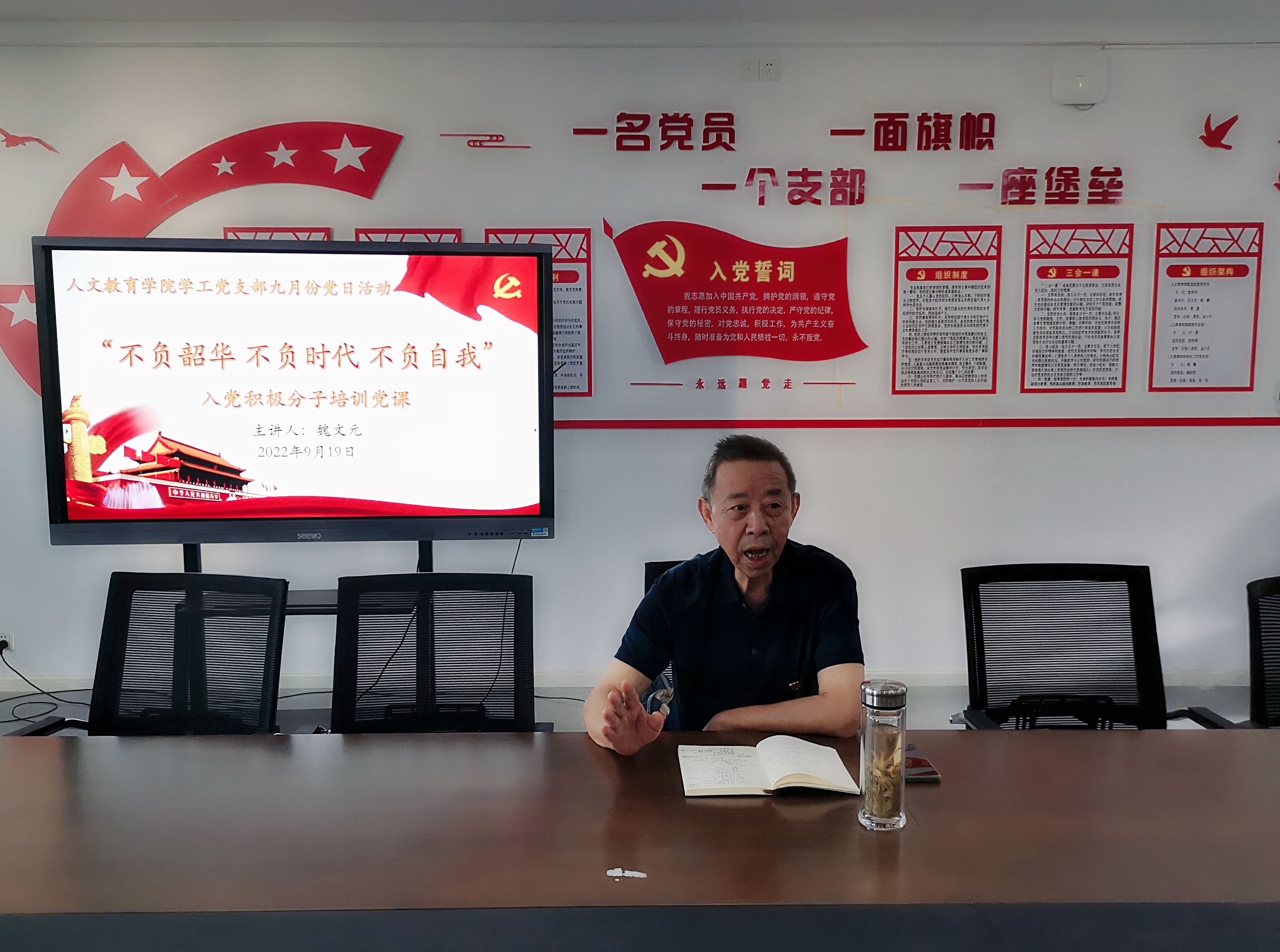 为进一步引导青年入党积极分子端正入党动机,增强党性意识,不忘初心,感恩奋进,人文教育学院学工党支部特邀校关工委老共产党员魏文元同志为学生入党积极分子上了一堂题为《不负韶华,不负时代,不负自我》的专题党课,全体学生入党积极分子认真聆听党课。