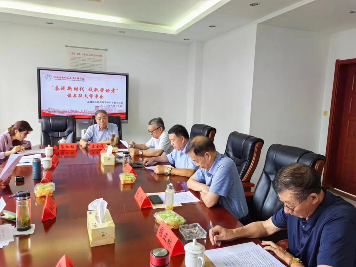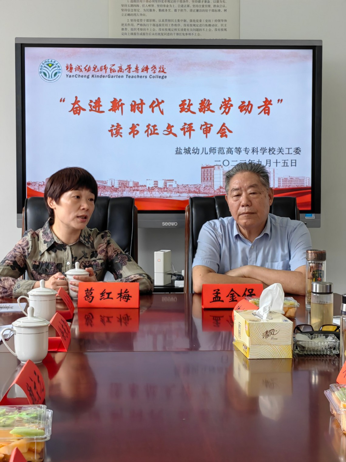 今年初,盐城幼儿师范高等专科学校关工委根据省教育关工委的统一部署,扎实开展主题教育活动,认真组织征文竞赛。各二级学院关工委根据要求,组织学生认真阅读《奋进新时代,致敬劳动者》丛书,组织老师们认真指导,撰写征文。七个学院通过筛选,共提交主题教育读书征文 60 余篇。为了公平公正做好评审工作,在组织初审和查重的基础上,9月15日,学校关工委在学校南校区行政楼五楼小会议室,又组织召开第二轮读书征文评审会。副校长、关工委常务副主任葛红梅,常务副主任孟金保,校团委副书记孙宇沁,关工委秘书长和二级学院关工委常务副主任(老同志)及多位老专家参加了评审会议。