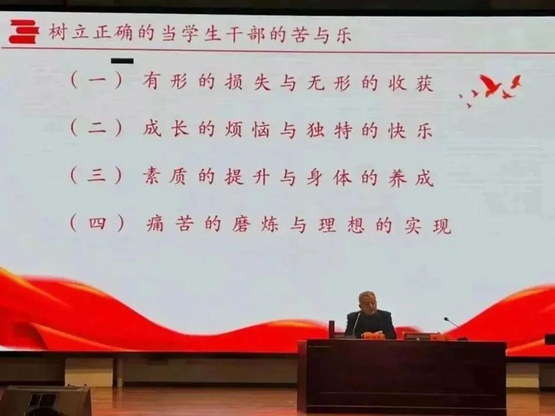 会上,陈旭东老主任首先从担任学生干部的意义、学生干部的职责、学生干部应具备的能力与素质等三个方面做了细致的讲解,带领学生干部深入学习了有形的损失与无形的收获、成长的烦恼与独特的快乐、素质的提升与身体的养成、痛苦的磨炼与理想的实现等四个方面,树立起正确的当学生干部的苦乐观。陈主任指出,班干部是班级的领头羊,是老师的得力助手,学生干部要充分发挥桥梁与纽带的作用,真正做到为全体学生服务。