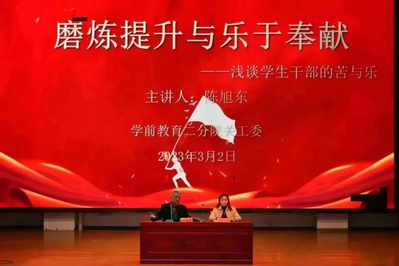 为进一步提升学生干部管理水平,充分发挥好他们的桥梁纽带作用和模范带头作用,加强各班班级管理和班风建设,3月2日下午,学院关工委常务副主任陈旭东主任在南校区行政楼三楼报告厅为我院学生干部开展了“磨练提升与乐于奉献——浅谈学生干部的苦与乐”的专题讲座。