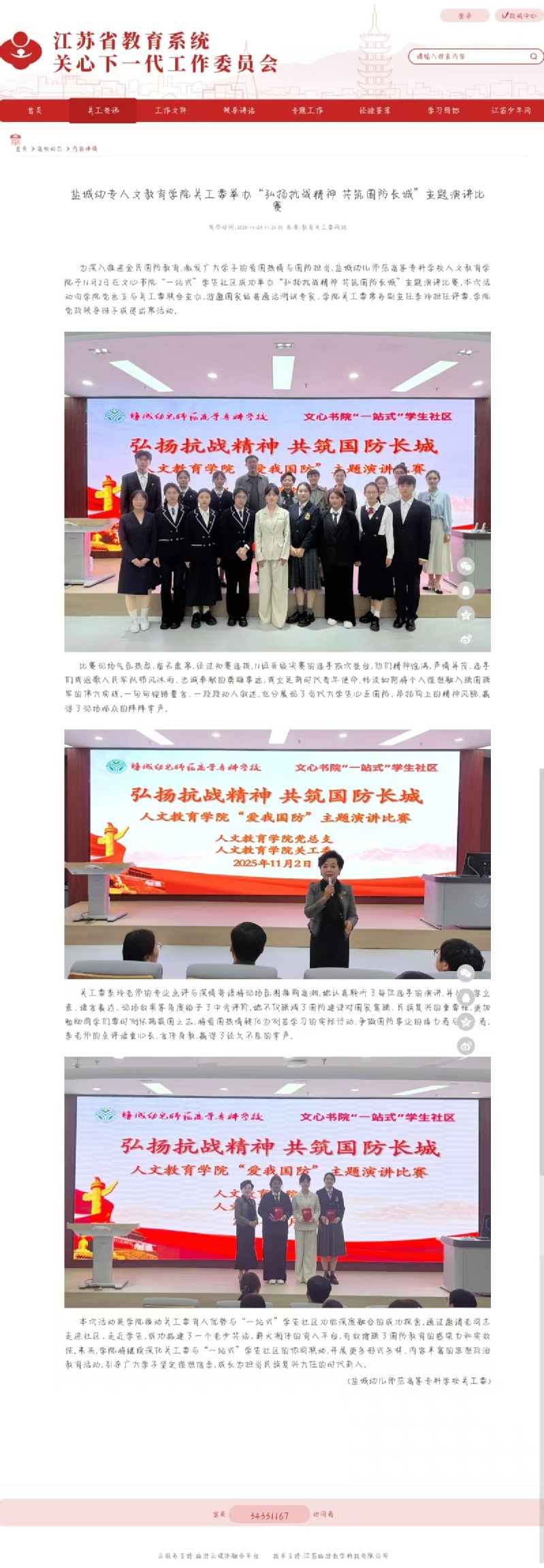 盐城幼专人文教育学院关工委举办“弘扬抗战精神 共筑国防长城”主题演讲比赛