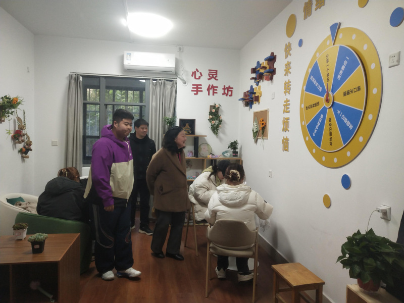 活动伊始,一行人步入“心灵手作坊”。温馨雅致的布置瞬间消融了距离感:墙面悬挂的“快来转转走烦恼”互动转盘色彩明快,“心灵手作坊”的暖心标识格外醒目,搭配错落摆放的绿植与柔软饰件,让整个空间充盈着松弛惬意的气息。同学们正围坐桌前专注体验手作,刘菊芳主任静静驻足观察,不时俯身与大家亲切交流,笑着称赞:“这样的空间就像一座‘心灵加油站’,手作时的专注不仅能创造美好,更是梳理情绪、治愈心灵的过程。”